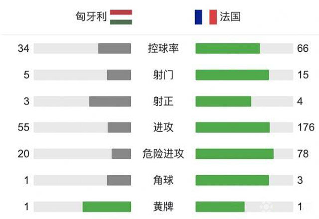 第66分钟,法国队反击机会,洛里大脚球直接开至前场,姆巴佩抢下皮球后横传,匈牙利球员解围不远,格列兹曼跟上射门得手,法国队1-1匈牙利。