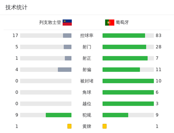全场比赛结束,最终葡萄牙2-0列支敦士登。