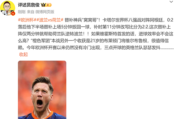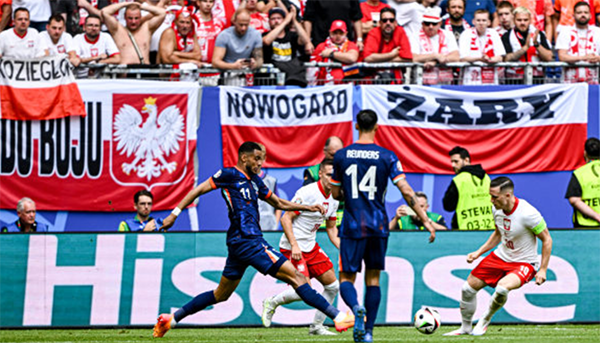 24直播网讯 一场荡气回肠的逆转,世界排名第七的荷兰队险些遭遇冷门,在先丢一球的情况下,橙衣军团以2-1逆转击败波兰,迎来开门红,韦霍斯特的替补建功,第83分钟的进球,帮助荷兰队取胜,赢得有惊无险。