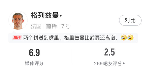 除了连续浪费机会之外,格列兹曼本场比赛浪费球权多达13次,错失两个必进球,数据都是全场最多的。所以在赛后球迷们纷纷批评他,甚至觉得他这场比赛浪费机会,比武磊还要离谱。