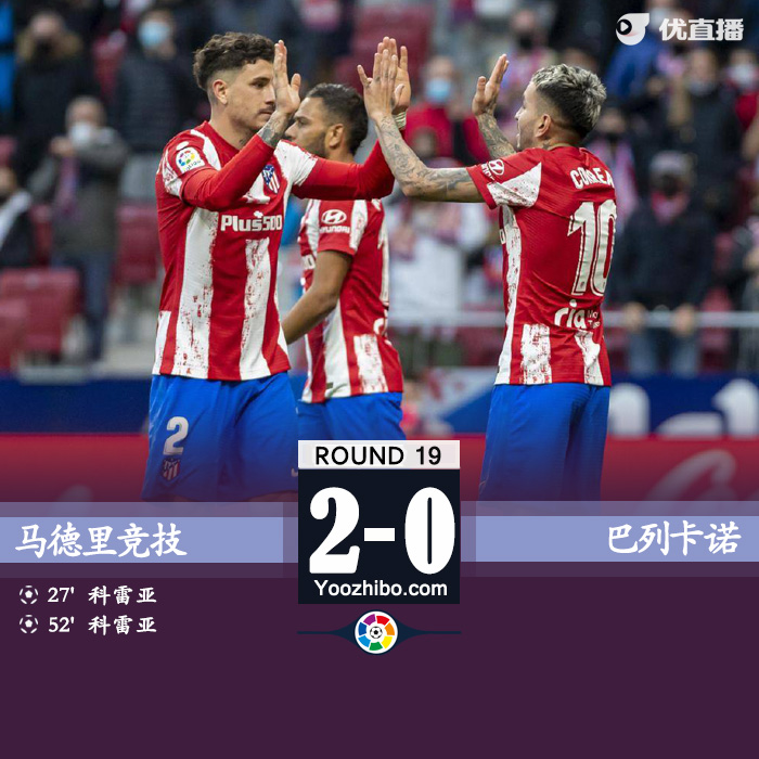 24直播网1月2日讯 北京时间1月2日23:15,西甲联赛第19轮,马竞主场迎战巴列卡诺的比赛,上半场科雷亚补射破门,下半场科雷亚完成梅开二度,最终,马竞2-0巴列卡诺。