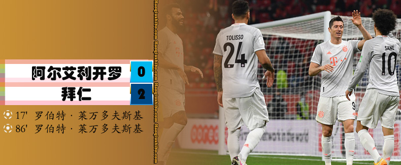 24直播网2月9日讯北京时间今天2:00,世俱杯半决赛拜仁迎战开罗国民的比赛准时开始。上半场莱万推射打开局面,半场拜仁一球领先。下半场回来拜仁依旧控制局面,终场前萨内助攻莱万再下一城,全场结束拜仁2-0击败开罗国民晋级世俱杯决赛。决赛中,拜仁将对阵墨西哥老虎大学队。