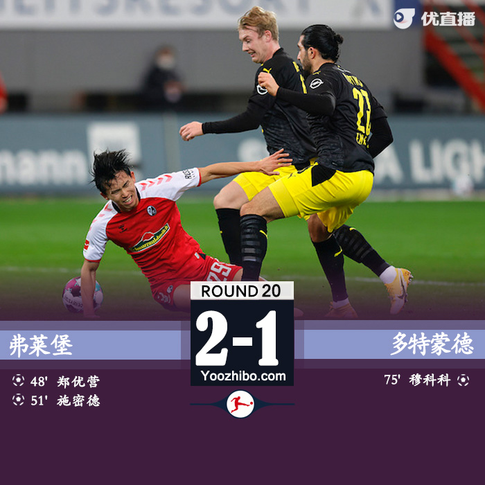 24直播网2月7日讯 北京时间2月6日22:30,2020/21赛季德甲联赛第20轮比赛继续进行,弗莱堡坐镇主场迎战劲敌多特蒙德。上半场埃姆雷詹远射中框,下半场郑优营、施密德先后远射破门,穆科科替补建功。全场比赛结束,最终多特1-2不敌弗莱堡。