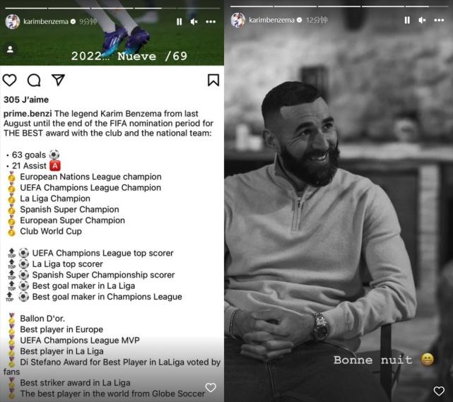 24直播网讯03月01日,皇马巨星本泽马在个人社交账号上晒出了一张照片,内容是FIFA年度最佳提名期间,他在俱乐部和国家队的进球助攻数据以及各类荣誉,以此来公开表达自己对于FIFA年度最佳球员评选结果的不满。
