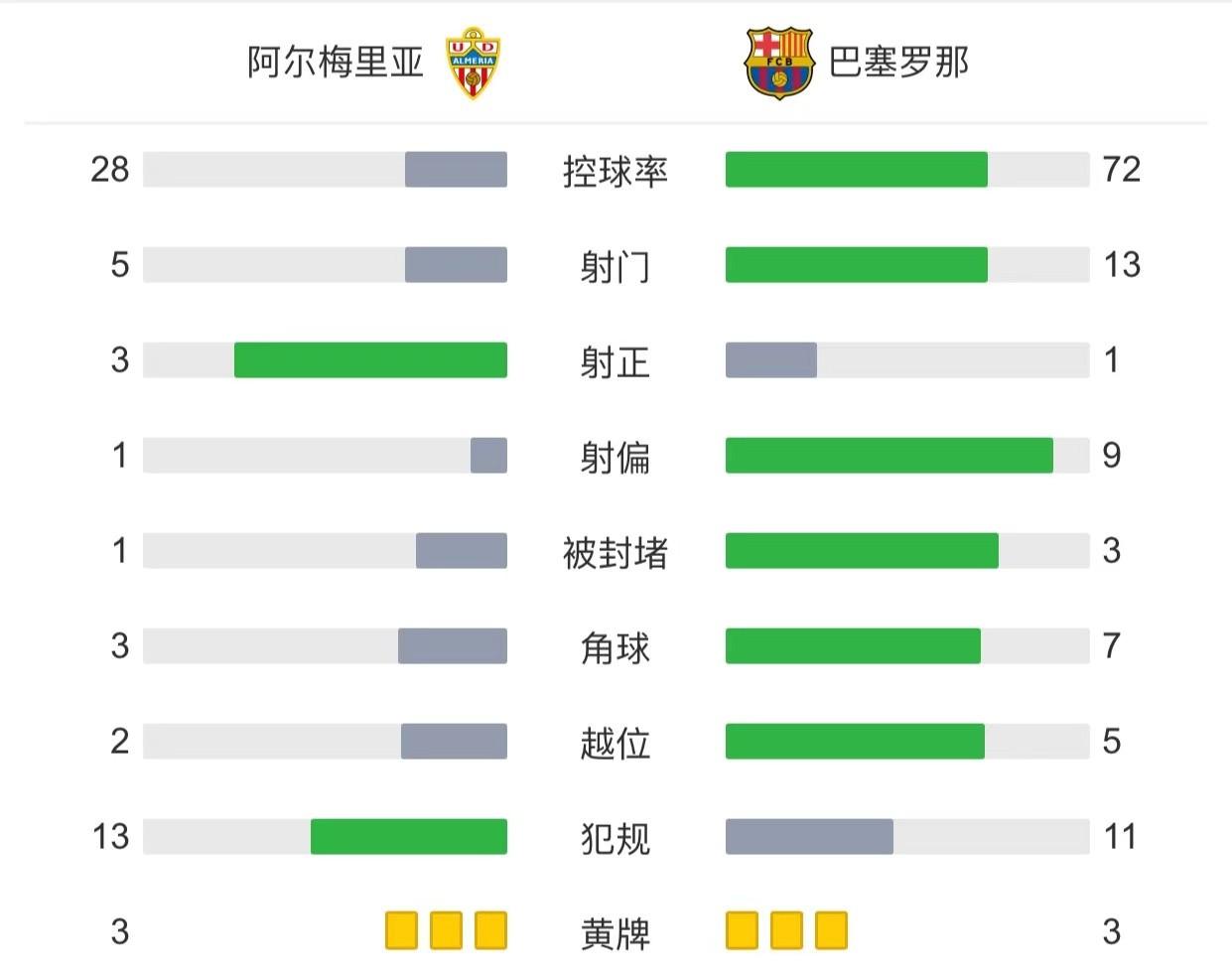 最终巴萨客场0-1阿尔梅里亚继续领跑积分榜。