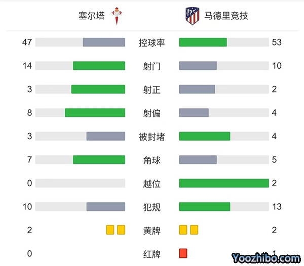 全场比赛结束,最终马竞1-0击败塞尔塔。