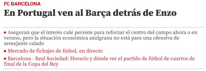 24直播网01月25日讯 据西班牙媒体《世界体育报》援引葡萄牙媒体报道,巴萨也有意签下本菲卡的阿根廷新星恩佐-费尔南德斯,但无法给出高报价。