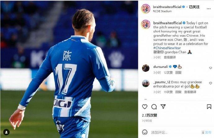 24直播网01月22日讯 西甲第18轮,西班牙人1-0皇家贝蒂斯,西班牙人前锋布莱斯维特身穿印有其曾祖父姓氏“陈”的球衣出战此役。