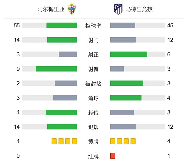 全场比赛结束,最终十人马竞客场1-1阿尔梅里亚。