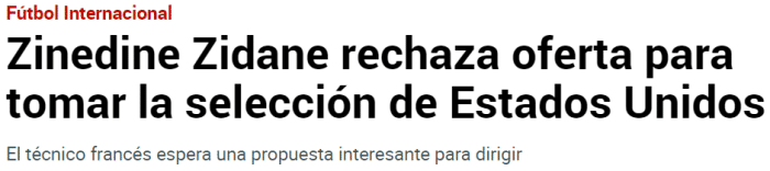 《马卡报》表示,美国足协邀请齐达内执教美国国家队,但被齐达内本人拒绝。除美国外,齐达内还拒绝了葡萄牙和巴西的邀请,如果执教国家队的话,他只想执教法国。