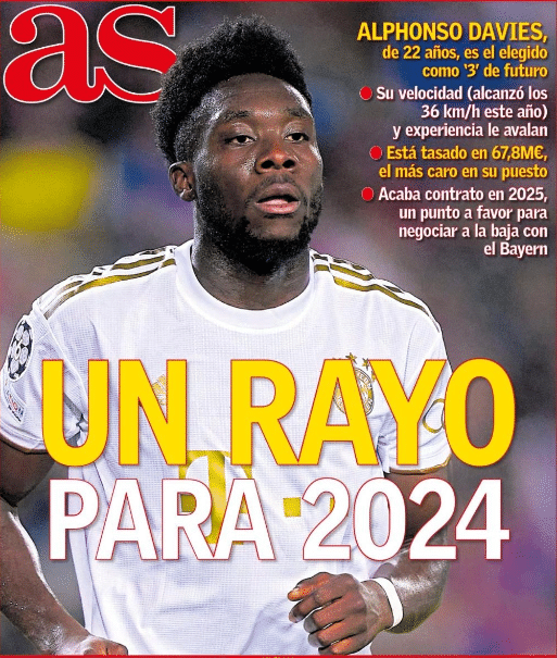 《阿斯报》头版表示,阿方索-戴维斯现年22岁,被皇马视为未来的“3号”,他与拜仁的合同将在2025年到期,皇马希望在2024年将其签下。