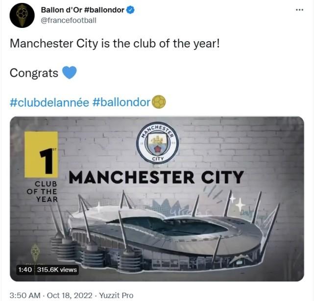 24直播网10月18日凌晨,2022年金球奖颁奖典礼公布了年度最佳俱乐部。最终英超冠军曼城当选,利物浦排名第2,皇马则位列第3。