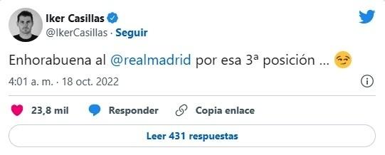 在评选结果出炉后,皇马官方社交账号发了一个眼睛的表情,表示惊讶和无法置信。众多媒体猜测,这是新科欧冠冠军得主对这一奖项表达不满。此外,皇马传奇门将卡西利亚斯更是直接发文讽刺道:“这是开玩笑的评选。”