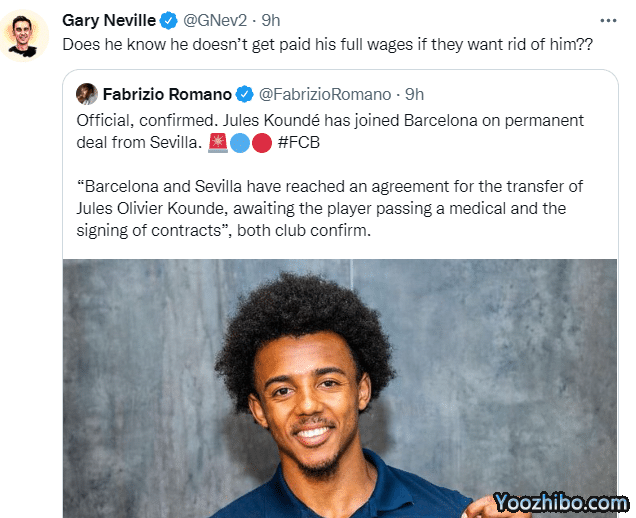 24直播网07月29日讯今天巴萨官宣签下塞维利亚中卫孔德,随后曼联名宿加里-内维尔在推特上发文嘲讽巴萨。