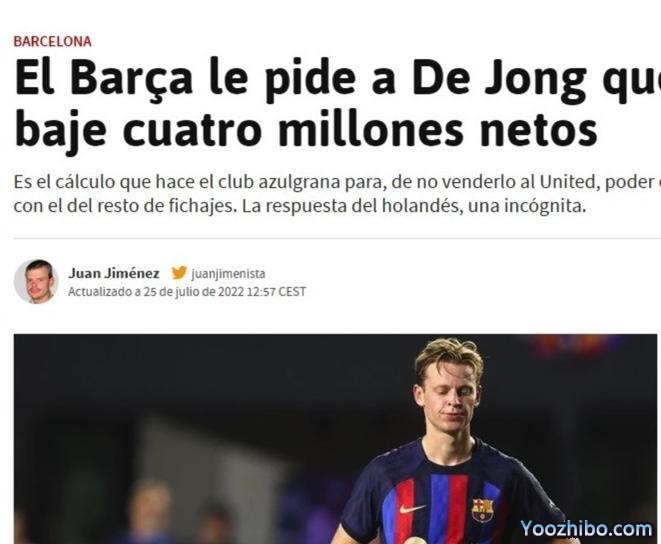 24直播网07月26日讯 关于德容的去留问题一直牵动着球迷们的心,今日,阿斯报消息,如果德容留队,巴萨要求他新赛季的薪水净额减少400万欧元。巴萨方面希望德容的薪水与球队新援的薪水相匹配,以便完成注册。