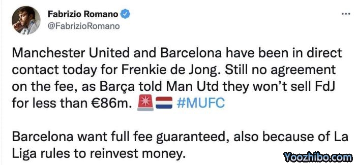 罗马诺在个人推特上写道:曼联和巴塞罗那今天直接商谈了德容转会,双方还没有谈妥转会费,巴萨告诉曼联,他们不会以低于8600万欧的价格出售球员。
