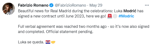 莫德里奇此前的合同今夏到期,但在夺得欧冠冠军后接受俱乐部电视台采访时,这位克罗地亚老将证实自己已经续约,他说道:“我已经和球队续约了,我们下赛季见!”