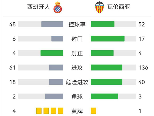 全场比赛结束,西班牙人1-1战平瓦伦西亚。