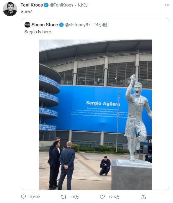 24直播网05月14日讯 消息,有网友称曼城的阿圭罗雕像神似皇马球星克罗斯,克罗斯在推特上做了回应。