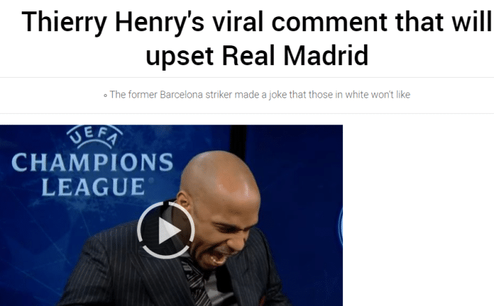 24直播网05月10日讯 据《每日体育报》报道,亨利最近在CBS节目中表示全世界都怕皇马,而皇马怕巴萨。