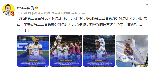 皇马在欧冠半决赛再次逆转晋级,詹俊微博发文:16强战第二回合第60分钟总比分0:2大巴黎;8强战第二回合第79分钟总比分3:4切尔西;半决赛第二回合第89分钟总比分3:5曼城;能解释的只有这五个字:伯纳乌--皇马!!!