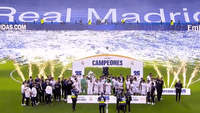 皇马的球迷们目睹球队夺冠,也在现场记录下这一幕,同时纷纷送上掌声。