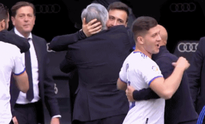 皇马主场夺冠,球迷们兴奋,球员们也都开始庆祝,他们相互拥抱,镜头也给实现五大联赛大满贯的主帅安切洛蒂,他与助手拥抱庆祝。