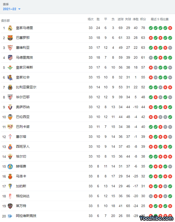 巴萨今天遭遇各项赛事主场三连败,现在他们33轮积63分排名第二,皇马则33轮积78分排名榜首。