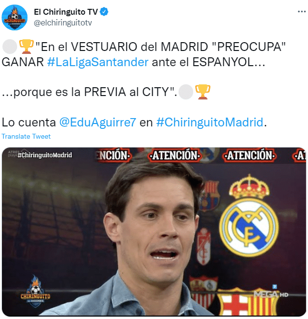 但记者透露,皇马更衣室对此有些担忧,他们担心提前夺得西甲冠军会让球队在欧冠中的表现遭到影响,皇马将在欧冠半决赛对阵曼城。