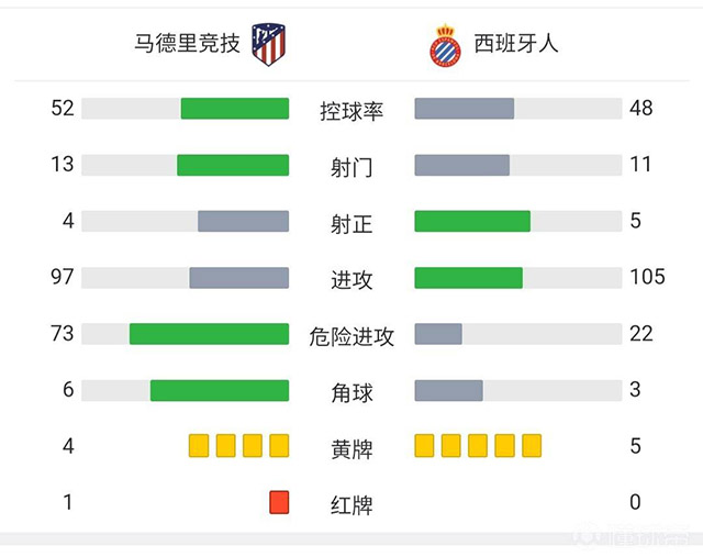 最终全场比赛结束,马德里竞技2-1战胜西班牙人。