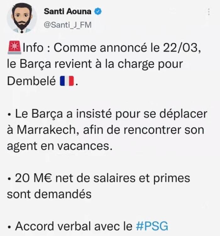 此外,Aouna还透露,登贝莱目前已经和巴黎达成口头协议。