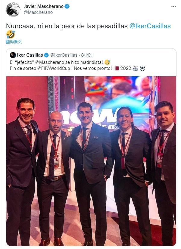 24直播网04月03日讯 消息,卡西利亚斯晒照调侃马斯切拉诺是马德里人,小马哥回复“在噩梦里也不可能”。