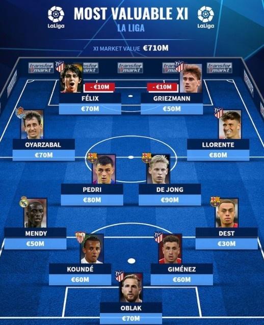 德转盘点西甲最贵阵容:皇马仅1人入选,半数球员来自马竞!