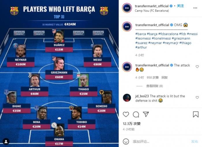 24直播网10月13日讯 本赛季,巴萨的战绩直线下滑,而球队之所以战绩不佳,主要是因为送走了梅西和格列兹曼,球队实力大幅下降,球员的信心也有所下降。而近日,德国权威媒体《转会市场网》盘点了最近几年离开巴萨的最佳阵容,这个阵容总价4.34亿欧元,不知道这套阵容和现在巴萨的主力阵容相比,哪一套阵容更强呢?话不多说,一起看阵容!