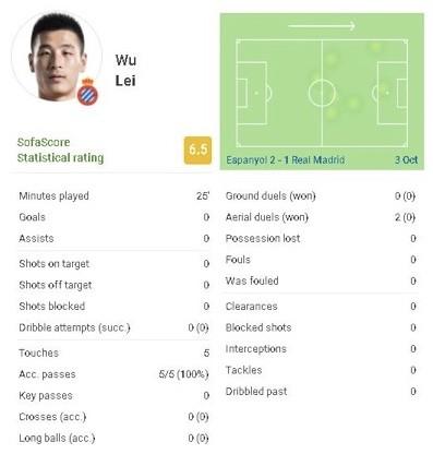 数据显示,武磊本场比赛上场25分钟,没有进球,没有助攻,没有射门,没有过人。事实上武磊本场比赛触球也只有5次,他5次传球,都到位。另外还有2次争顶,未成功,武磊大部分数据都为0。