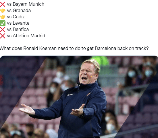 24直播网10月03日讯 根据数据统计,巴萨最近6场各项赛事只取得1场胜利,状态相当糟糕。