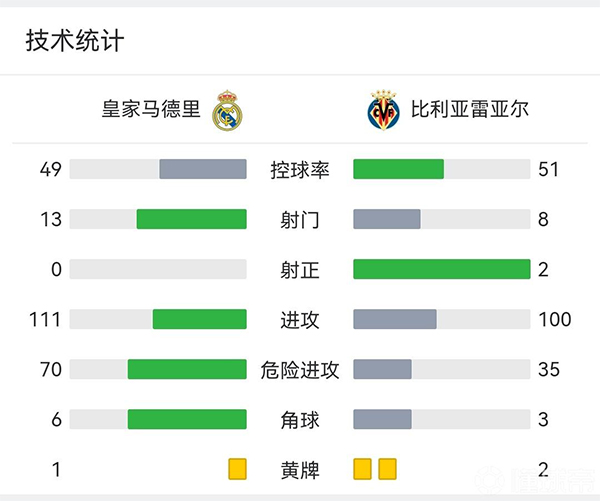 全场比赛结束,皇马主场0-0比利亚雷亚尔。