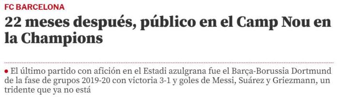 这是时隔22个月以来,巴萨的欧冠主场比赛第一次有观众入场。上一次巴萨在有观众的主场踢欧冠联赛,还要追溯到2019年11月27日,当时凭借梅西、苏亚雷斯和格里兹曼的进球,巴萨3-1战胜多特。