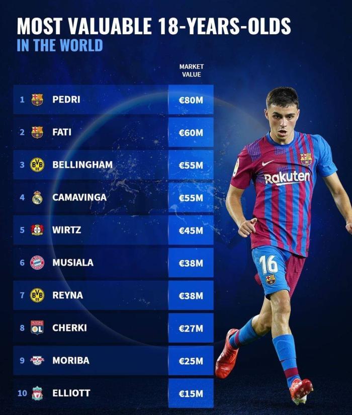 24直播网9月11日 讯:就在刚刚,德转统计了世界足坛18岁球员的身价排行。在这份榜单当中,巴萨天才小将佩德里以8,000万欧元排在第1位。这位年轻的西班牙小将在过去两个赛季开始在足坛展露头角。就是在上个赛季,佩德里在俱乐部国家队以及国奥队累计出战74场,成为了上赛季出战次数最多的球员。