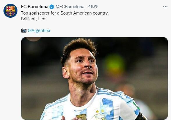 24直播网9月11日讯 今天,梅西完成帽子戏法,以79球打破了此前的南美国家队进球纪录,对于这个特殊的时刻,巴萨也发来祝贺。