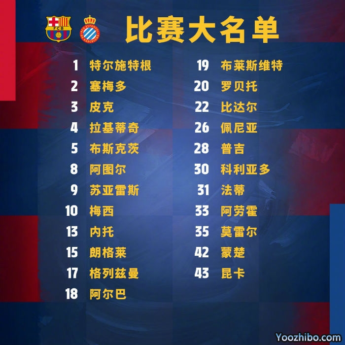 巴萨vs西班牙人大名单:梅西领衔 菲尔波伤缺!