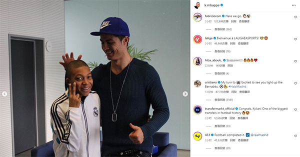 24直播网讯 北京时间6月4日凌晨,在皇马官宣签下姆巴佩后,法国天才也第一时间在社媒激动发表感言,他还动情晒出了与偶像C罗的合影。而C罗本人也迅速在这条动态下留言评论互动,祝贺姆巴佩加盟皇马。