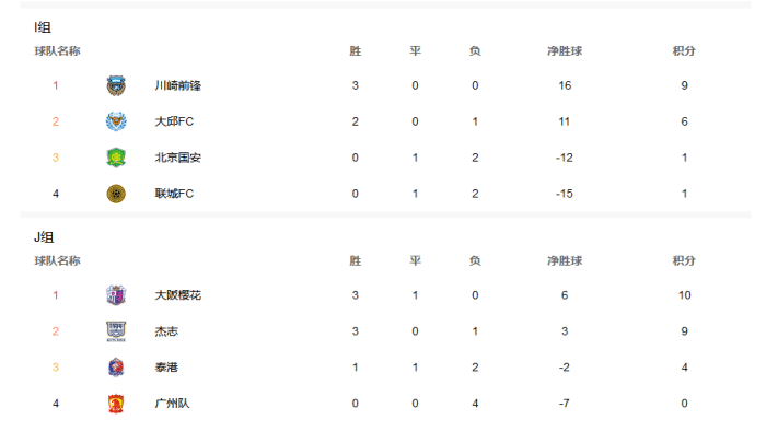 目前,亚冠东亚区的各大小组均被K联赛和J联赛球队“统治”。I组:J联赛冠军川崎前锋3连胜获得了9分,狂轰18球;第二名的大邱FC拿到6分,打进了14球;北京国安派出青年军没有垫底,拿到了一个积分,排名第三,打进1球丢了13球;垫底的是菲律宾球队联城,1分,打进1球狂丢16球。