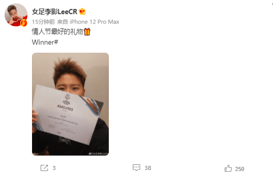 24直播网02月15日讯 北京时间今天,女足前锋李影晒出亚洲杯冠军证书,并发文:“情人节最好的礼物,冠军”