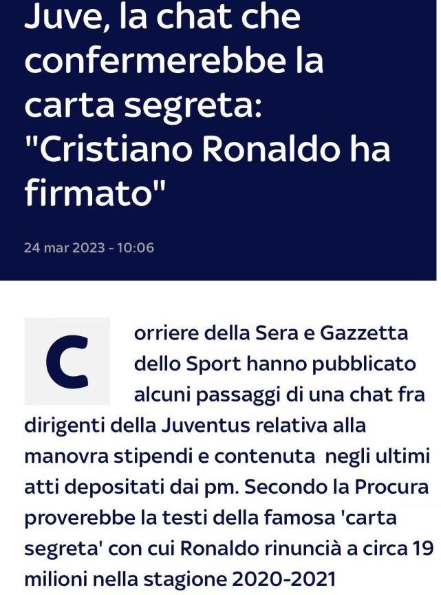 24直播网讯03月25日凌晨,来自《晚邮报》和《共和报》等多家意大利知名媒体的报道,关于尤文财务造假案件的调查,又出现了一个新的有力证据。一份被曝光的聊天记录证实,尤文管理层内部曾经讨论过C罗等球员,接受私下协议的事宜,并且确认C罗在合同上签下了名字。