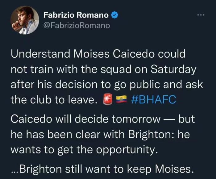 罗马诺表示,凯塞多在递交转会申请后,没有参加布莱顿周六的训练。