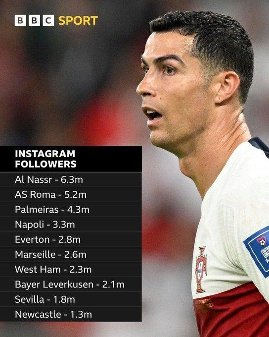 24直播网01月03日讯 BBC统计表明,利雅得胜利的Instagram粉丝数在签下C罗后暴涨。