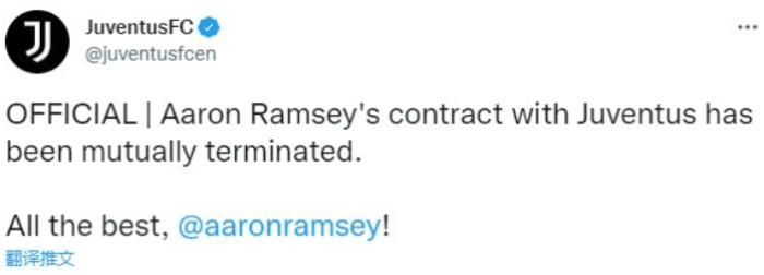 24直播网07月27日讯 据尤文图斯官方消息,俱乐部已与拉姆塞提前解约,这位威尔士国脚现在已成为自由球员。