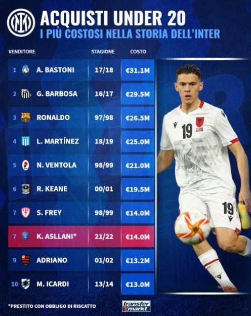 24直播网07月01日讯 今日,德转网站对国米队史引进的U20球员转会费进行了排序,巴斯托尼是3110万欧元最贵,大罗2650万欧元排名第三,阿斯拉尼排名第7名。