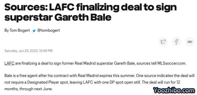 24直播网06月26日讯 晚,来自美职联记者Tom Bogert的最新消息,美职联劲旅洛杉矶FC即将敲定威尔士巨星贝尔,这则消息也得到了TA名记奥恩斯坦和转会专家罗马诺的确认。